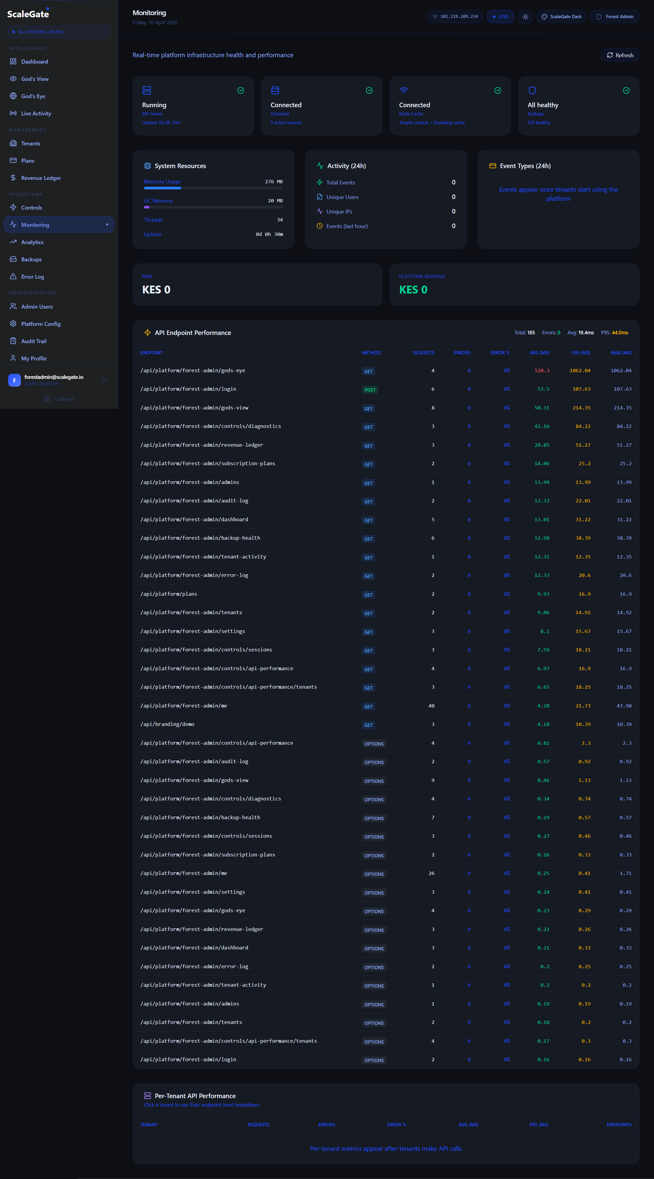 If something is wrong with the platform, this is the first page you check. The four green cards at the top should all stay green — if any goes red, there's a real outage. The endpoint table tells you which API routes are slow or failing.