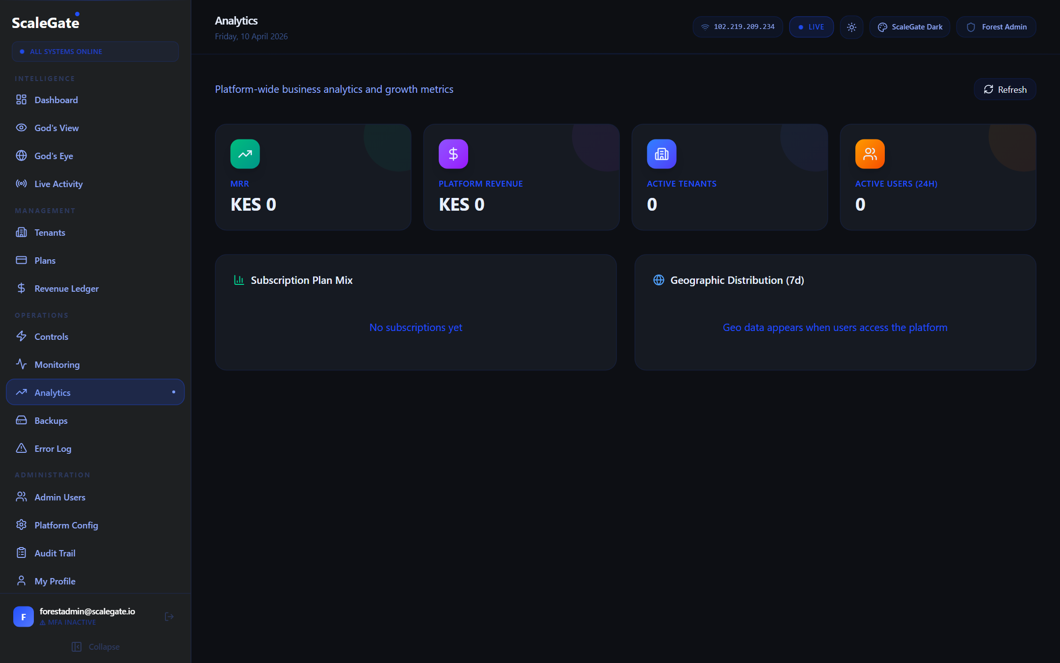 The Dashboard is your "first room" after logging in. The dark left sidebar is now visible on every page from here on — it's how you navigate everything. From top to bottom you'll see: Dashboard, God's View, God's Eye, Live Activity, Tenants, Plans, Revenue Ledger, Controls, Monitoring, Analytics, Backups, Error Log, Admin Users, Platform Config, Audit Trail, My Profile.