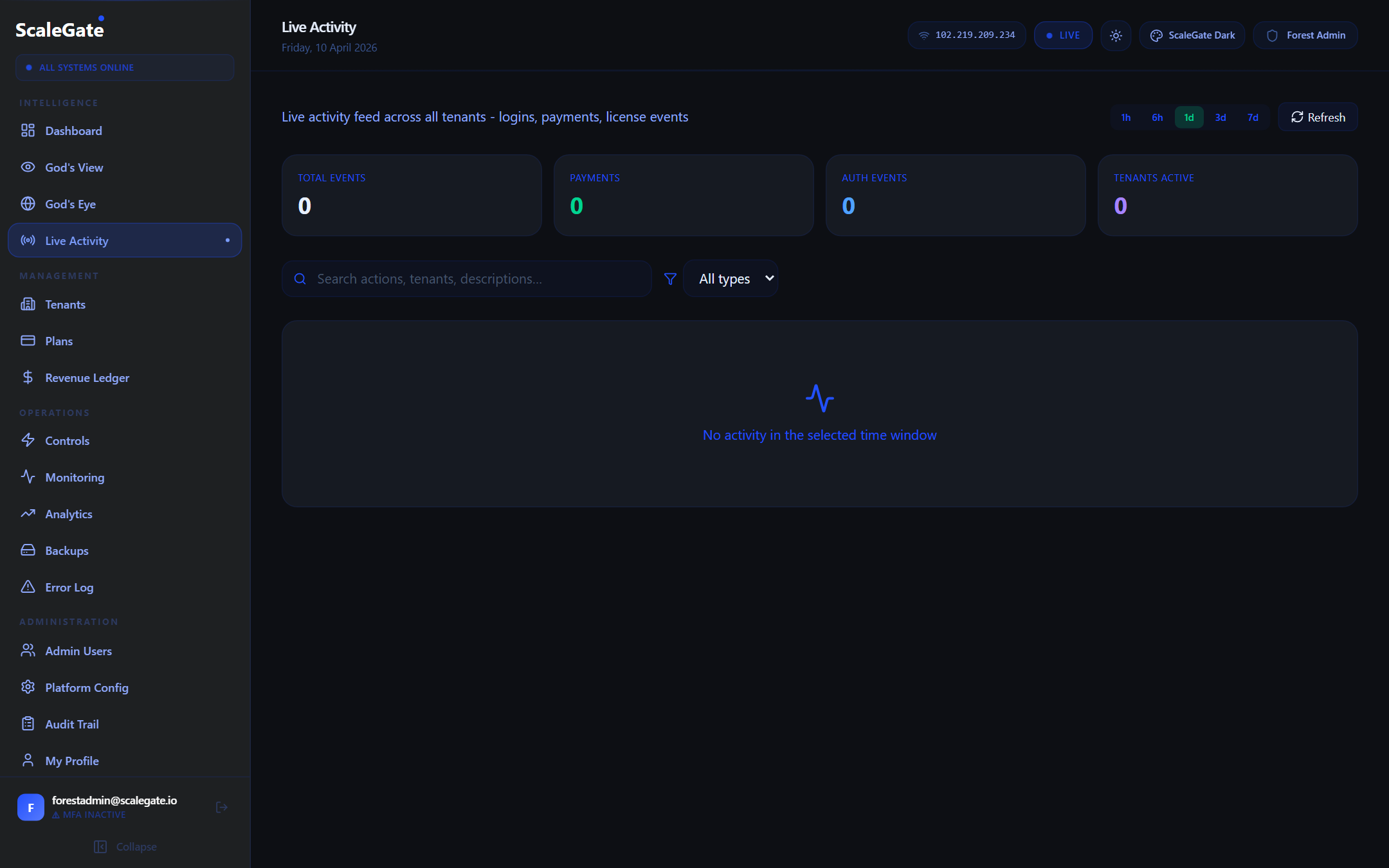 The Live Activity page (sidebar: "Live Activity") is a federated feed of what's happening inside every tenant database — logins, payments, license events. Subtitled "Live activity feed across all tenants - logins, payments, license events". Time-range chips on the right (1h / 6h / 12h / 24h / 3d / 7d).