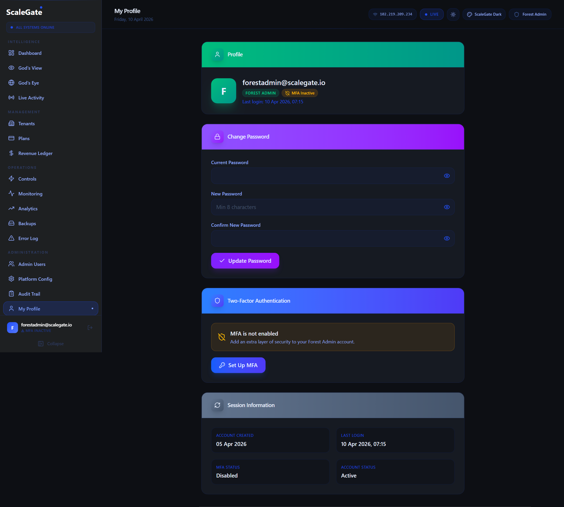 - Profile (green header) — your avatar, email (forestadmin@scalegate.io), a green "FOREST ADMIN" badge, an amber "MFA Inactive" warning badge, and your last-login timestamp.